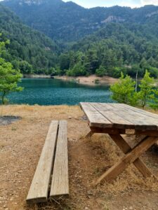 Γύρω από τη λίμνη υπάρχουν αρκετά τραπεζάκια και χώροι για πικνίκ, όπου μπορείτε να καθίσετε και να απολαύσετε το γεύμα σας με θέα τη λίμνη. Το σκηνικό είναι ιδανικό για χαλάρωση και αποσύνδεση από την καθημερινότητα. Πάρτε μαζί σας ένα καλάθι με φαγητό και απολαύστε την ηρεμία και την ομορφιά του τοπίου.